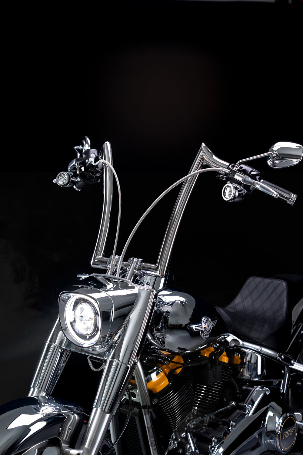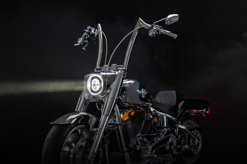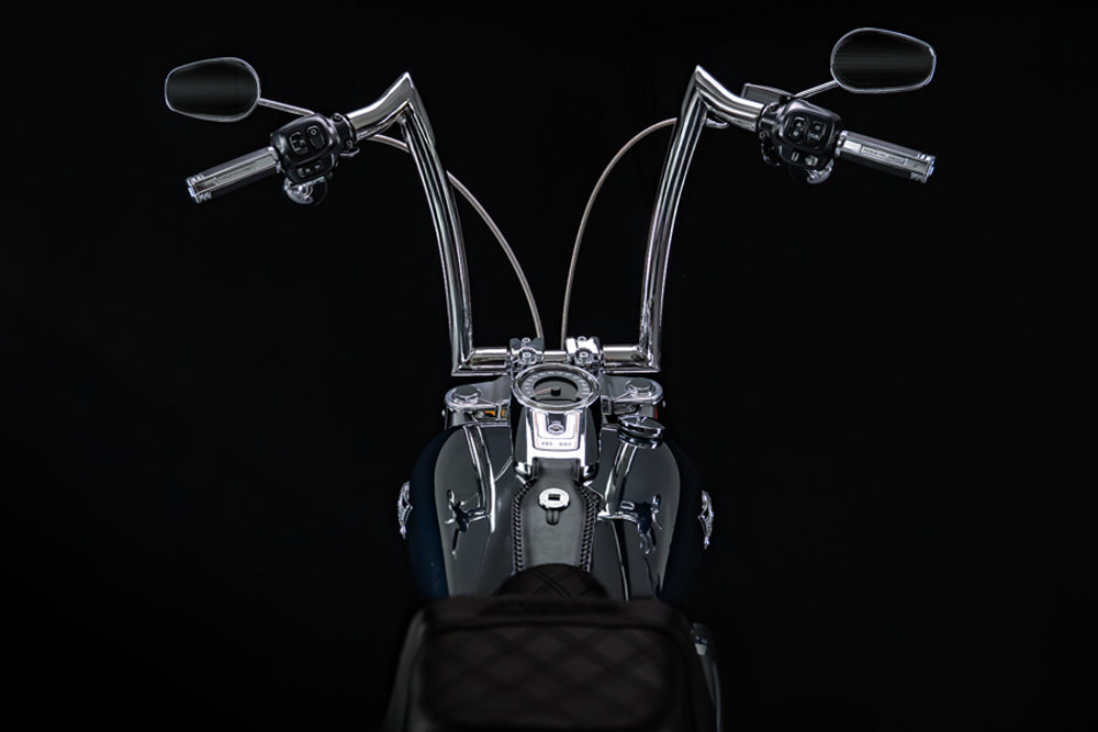 Our Signature 1 3/4” Heavyweight Apes fit the design and style of the touring bikes seamlessly. They look super tough and aggressive but without jumping the shark.
